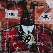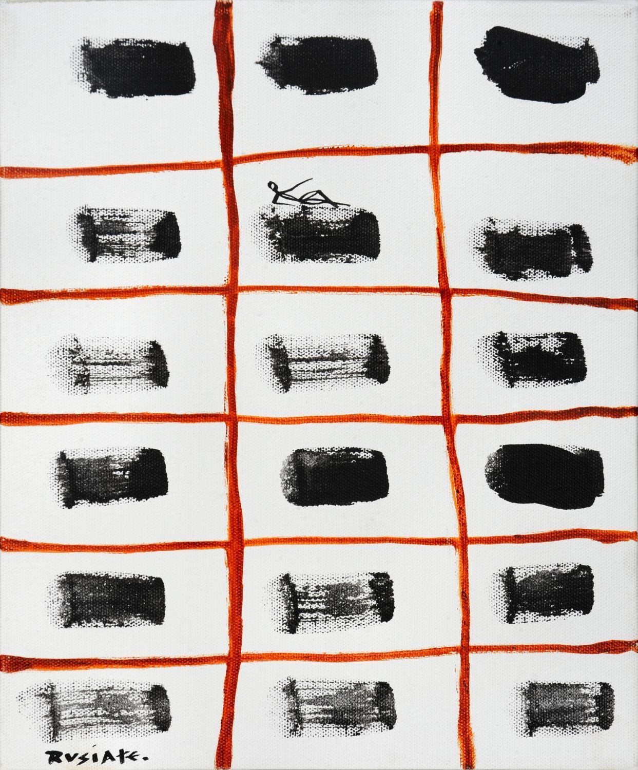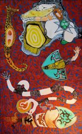 In this stunning masterpiece, the artist Rusiate has spent time on creating a work that hits you in the face and then demands that you linger slowly over every centimeter of his canvas. His masterly use of mixed media is taken to new heights.